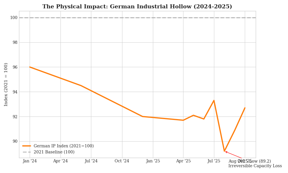 The data: Germany’s Industrial Production Index (2021=100) crashed to a low of 89.2 in August 2025. While there was a minor “dead cat bounce” in October (to 92.7), the trend is a structural ratchet downwards—a 4.8% decline in 2024 followed by continued volatility in 2025.