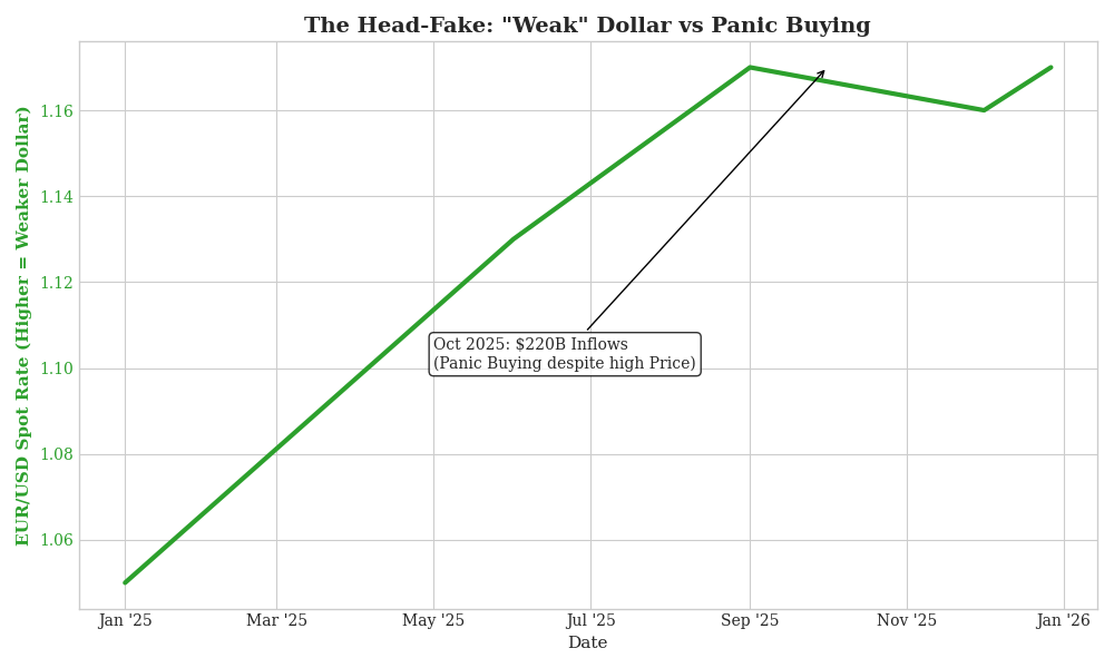 The Head-Fake: Throughout late 2025, the Euro actually rose against the Dollar (reaching ~$1.17). Mainstream pundits hailed this as the “end of the strong dollar.”