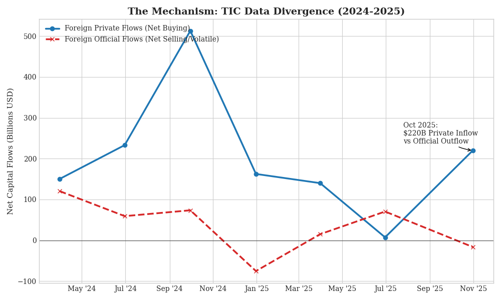 The Treasury International Capital (TIC) reports from late 2025 reveal the smoking gun. We see a violent bifurcation between the people (Private) and the state (Official).